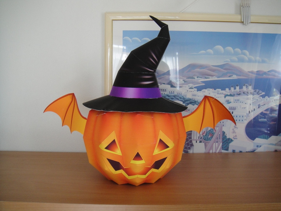 ペーパークラフトやカボチャのライトが置いてあるので、彼女の居場所が半分以下になってしまいました