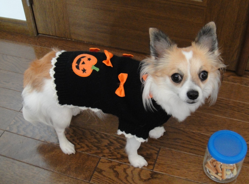 LUNAに去年買ったハロウィン仕様セーターを着せました。 去年は確かお尻まで隠れたはずなのに… 今年はお尻見えてるし… 成長し過ぎてます… 我が家の女はみんな大きい! 私=166cm 月ちゃん=12歳ですでに161cm(体重は私を超えている…) LUNA=チワワなのに3kg超え…