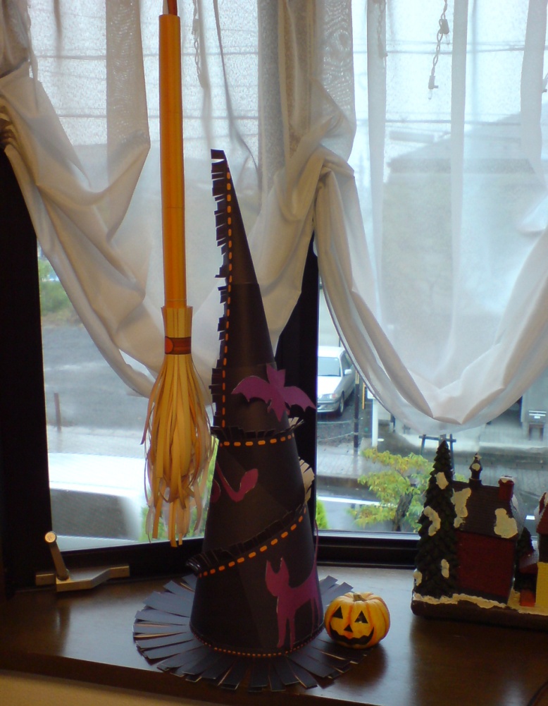 魔女の帽子と箒(カボチャは本物だけど食用ではなく飾り物)